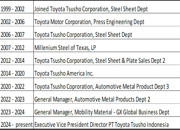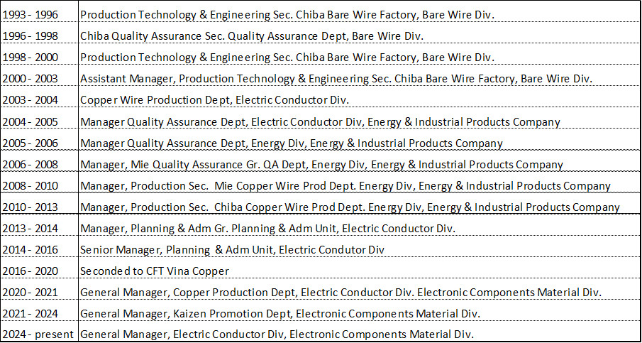 | Educational Background | : Master of Metal Engineering, Division of Engineering, Chiba Institute of Technology, Chiba, Japan in 1993 | |